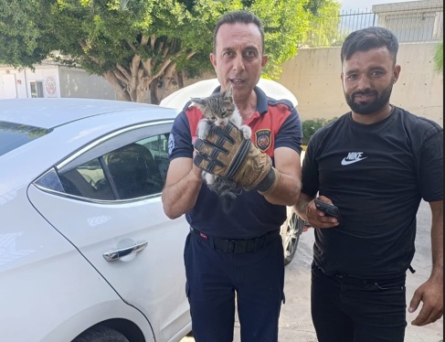 İskenderun ilçesinde park halindeki bir araçtan gelen sesleri duyan sürücü, motor kısmını kontrol ettiğinde bir yavru kedinin sıkıştığını fark etti. Durumu hemen 112 Acil Çağrı Merkezi’ne bildirdi.