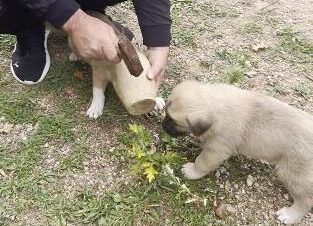 Durumu fark eden restoran müşterisi Kenan Köse, dikkatli bir şekilde testiyi kırarak yavru köpeği kurtardı. Köpeğin zarar görmemesi için testiye yavaşça çekiçle vuruldu.