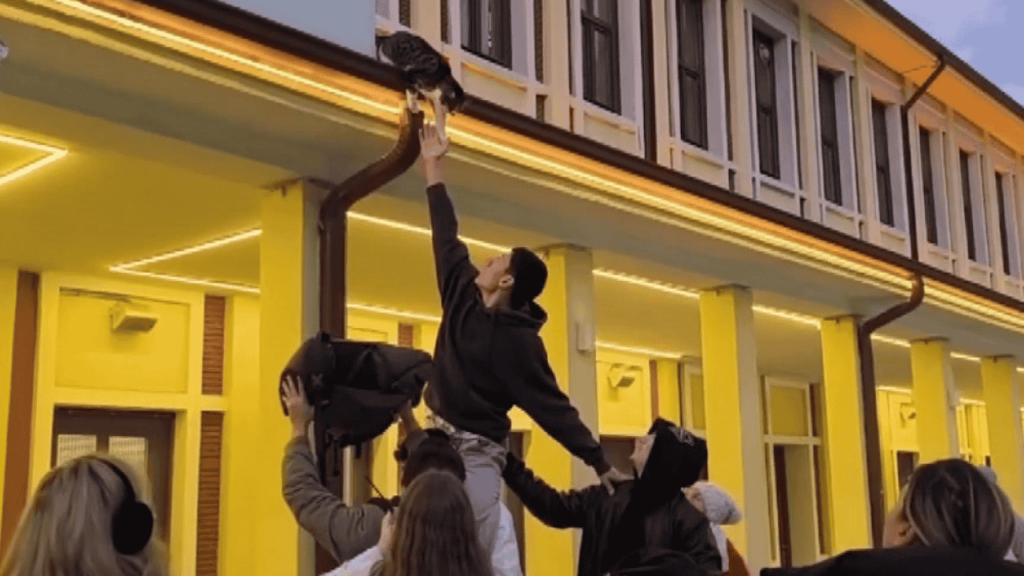 Bir grup genç, kediyi güvenli şekilde aşağı indirmek için çatıya ulaşmaya çalıştı. Olası bir düşme ihtimaline karşı aşağıda çantalarını açarak önlem alan gençler, hayvanın zarar görmemesi için dikkatli davrandı.