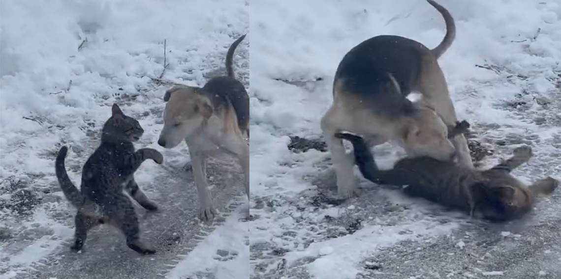 Kedi ve köpeğin karda oynadığı sevimli anlar, hem bölge halkının yüzünü güldürdü hem de sosyal medyada viral oldu. Olay, hayvan dostluğunun sınır tanımadığını bir kez daha gösterdi.