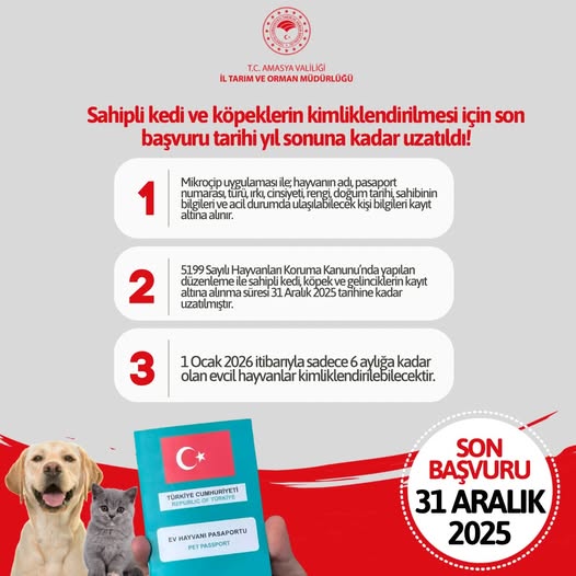 Tarım ve Orman Bakanlığı, sahipli kedi, köpek ve gelinciklerin mikroçiple kimliklendirilmesi için verilen sürenin 31 Aralık 2025’e kadar uzatıldığını açıkladı. Mikroçip uygulamasıyla hayvanın kimlik bilgileri, sahibinin iletişim bilgileri ve acil durumda ulaşılabilecek kişi bilgileri resmi sisteme kaydediliyor. Bakanlık, 1 Ocak 2026’dan itibaren yalnızca 6 aylığa kadar olan evcil hayvanların kimliklendirilebileceğini hatırlatarak hayvan sahiplerini uyardı.